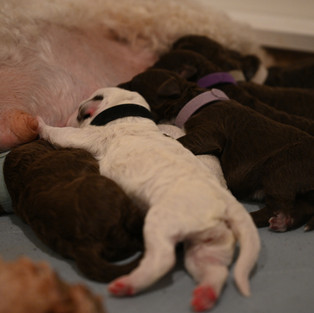 We have 5 girls and 2 boys (Baby blue collar & lavender collar). All are doing well. They have regained their birthweight and then some now. They are strong vigorous nursers. Cannella is a good mother to them. She tends them regularly.